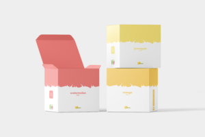 In the packaging, I extended the same concept utilized in the labels, with a slight modification. Instead of the transparent part, I assigned a distinct color to each specific fruit, aligning with its taste. Each package features the color associated with that particular fruit, incorporating the splash and design elements inspired by the labeling. This consistent approach ensures that the packaging vividly represents the flavor of the juice inside, mirroring the visual identity established through the labels.