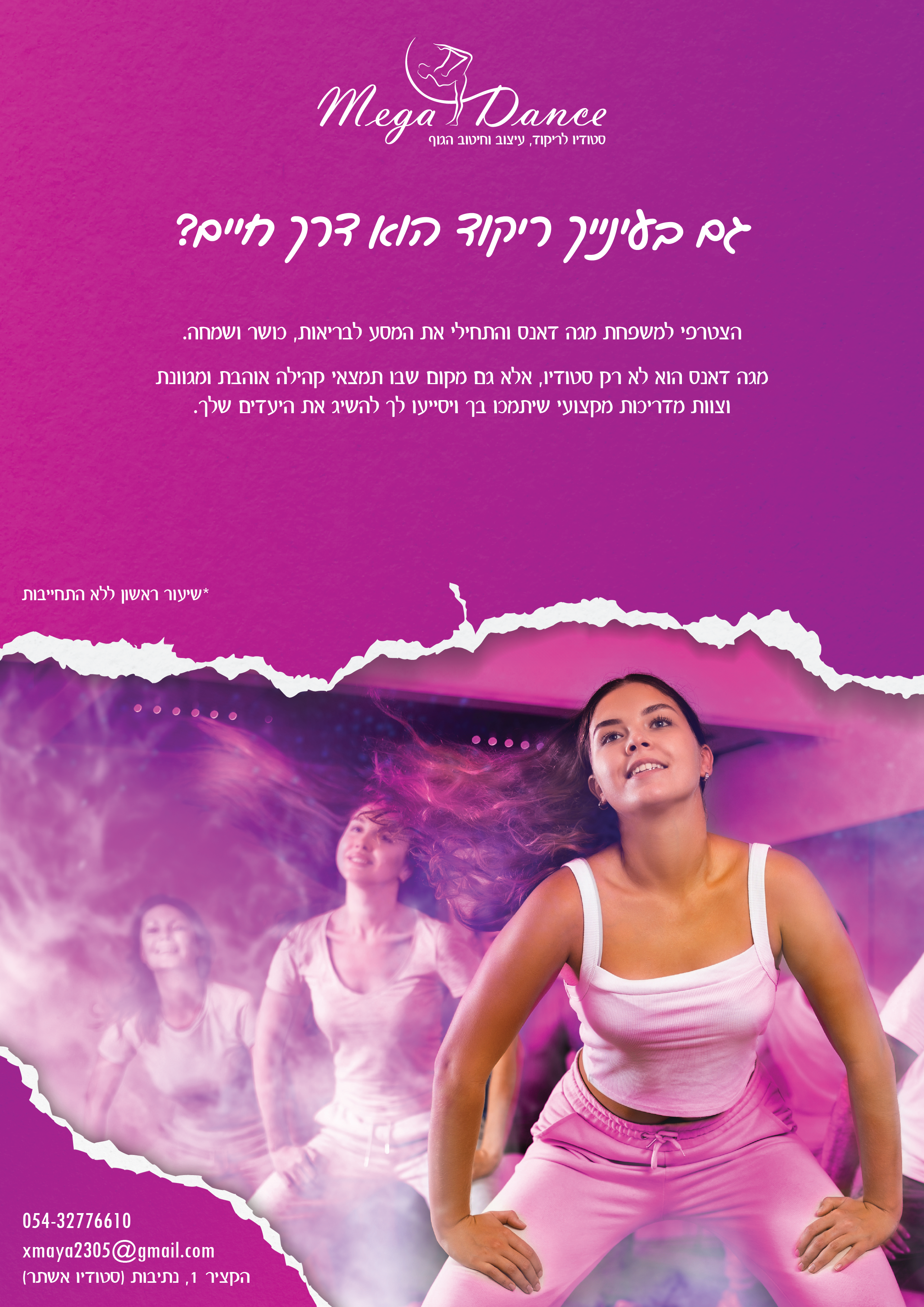 Mega Dance Studio, founded by Maya Maimon in 2004, is a dance studio designed for women and girls from the age of 14, and focuses on providing dance and programs while encouraging social interactions for the studio members. Due to the effects of COVID-19, the studio temporarily halted its activities for two years. Following the conclusion of the pandemic, the founder decided to reopen the studio, along with a rebranding process to redefine its identity.